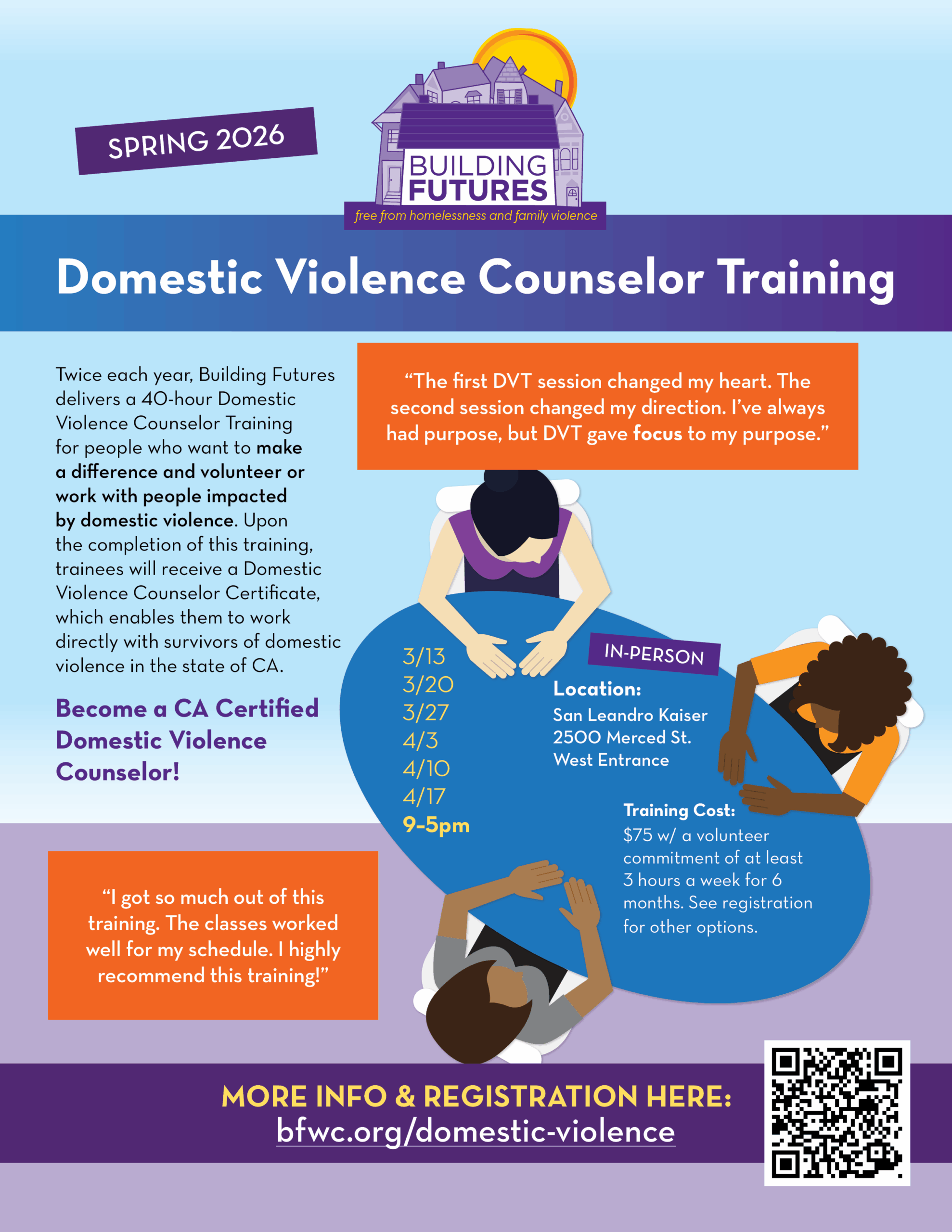Twice each year, Building Futures conducts a Domestic Violence Counselor Training which meets the requirements set by the state of California for training Domestic Violence Counselors. After successfully completing the training, participants receive a Certificate of Completion that allows them to pursue volunteer and employment opportunities working directly with survivors of domestic violence in the state of California. In addition to foundational information on domestic violence, this training emphasizes working with domestic violence survivors who are experiencing homelessness and/or mental health and/or substance use issues. The curriculum also covers housing issues domestic violence survivors may be facing as a result of their trauma. Building Futures’ Domestic Violence Counselor Training includes presentations by professionals in the field, information sessions, and activities and discussions facilitated by Building Futures’ Domestic Violence Outreach Team. To find out more about the Domestic Violence Counselor Training, please contact us at dvoutreachteam@bfwc.org.